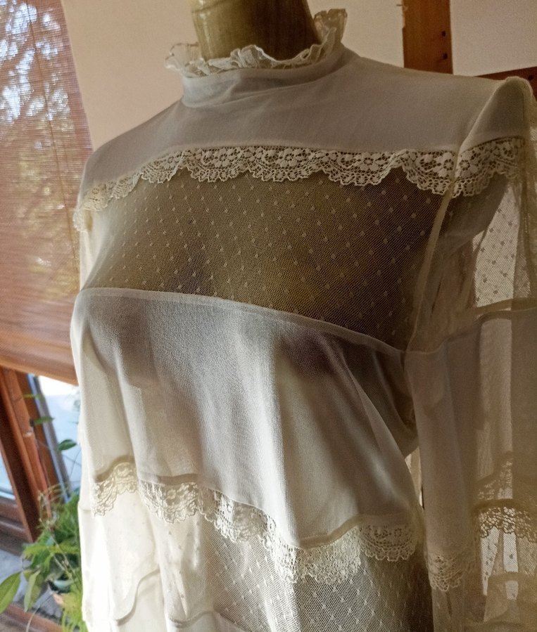 krem renkte, vintage, yüksek yakalı ve uzun kollu vintage bohem tarzda, nakış detaylı, dökümlü ve bol kesim bluz. M bedene uygun. Etiketsiz sıfır ürün