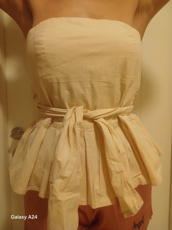 Krem renginde, kısa ve vücuda oturan, desensiz , belinde bağlama detayıyla.