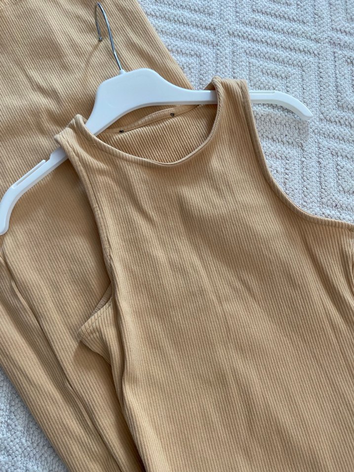 Pastel bej renkte, vücudu saran bir elbisedir boyu 102 cm ve yırtmaçlı bir elbisedir yeni gibidir.