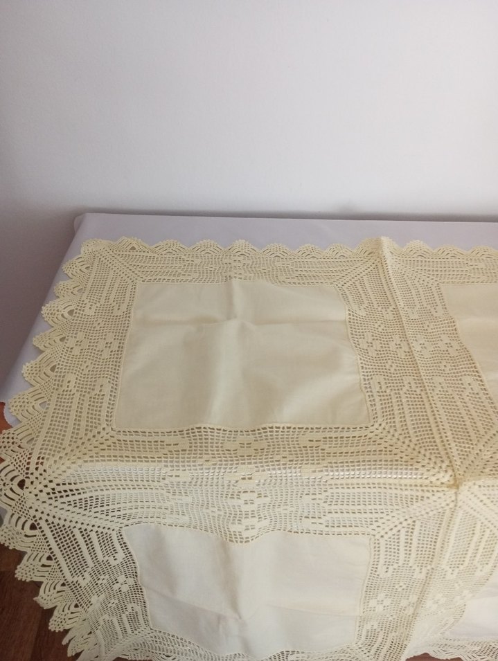 Krem renginde, klasik el işi dantel işlemeli masa örtüsü. Masanıza geleneksel bir dokunuş katmak için ideal.