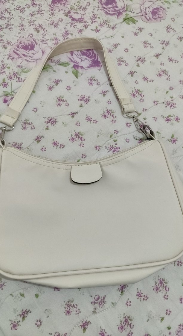 Düz beyaz renkli, tokalı kapaklı, yumuşak sentetik kumaştan günlük kadın omuz çantası. Sokak modasına uygun sade tasarım.