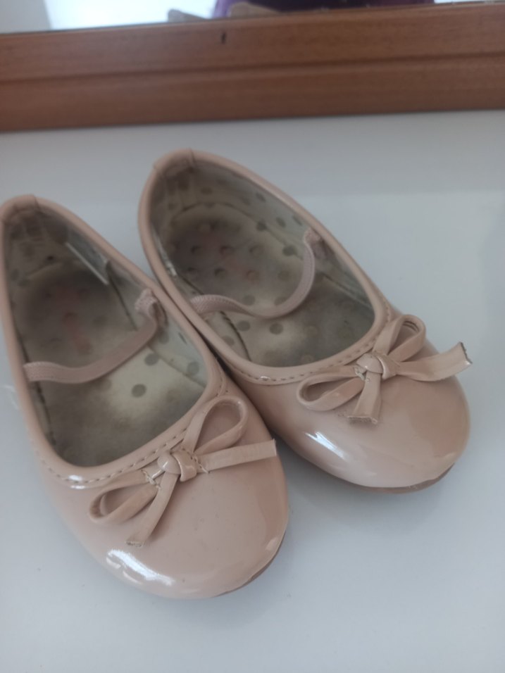 Krem renk kız çocukları için, düz ve parlak lastik malzemeden yapılmış, önünde fiyonk detaylı babet ayakkabılar. Pastel tonlarda ve desensizdir.