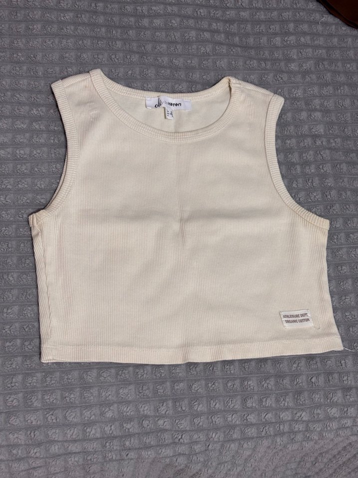 Krem renkli, kolsuz, kısa kesim atlet. Pamuk kumaştan yapılmış, düz ve basic tasarımlı, günlük kullanıma uygun şık bir parça.