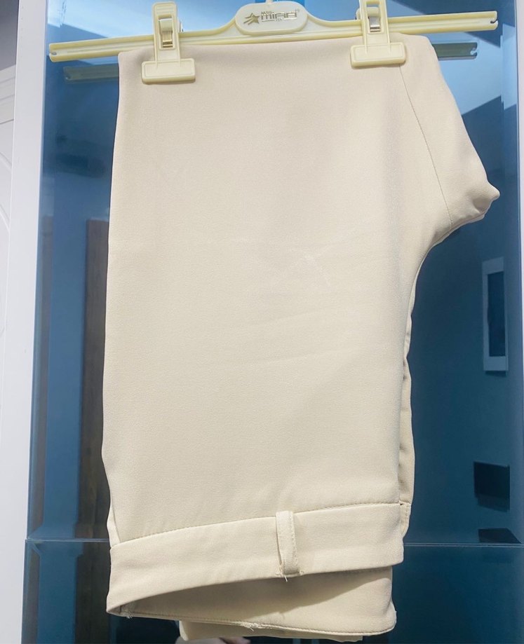 Krem renk midi boy, pilili kadın kumaş pantolon. Normal kesim, ofis kullanımı için uygun, sentetik kumaştan üretilmiştir. Minimalist tarzda. #pantolon #kumaşpantolon #zara #mango #seçil #setrems #bershka #koton