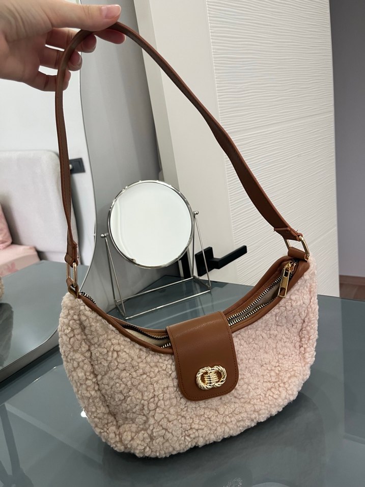 Krem renginde, peluş detaylı dış yüzeye sahip kadın çantasıdır. Kahverengi askı ve fermuar kapama ile günlük kullanıma uygundur.