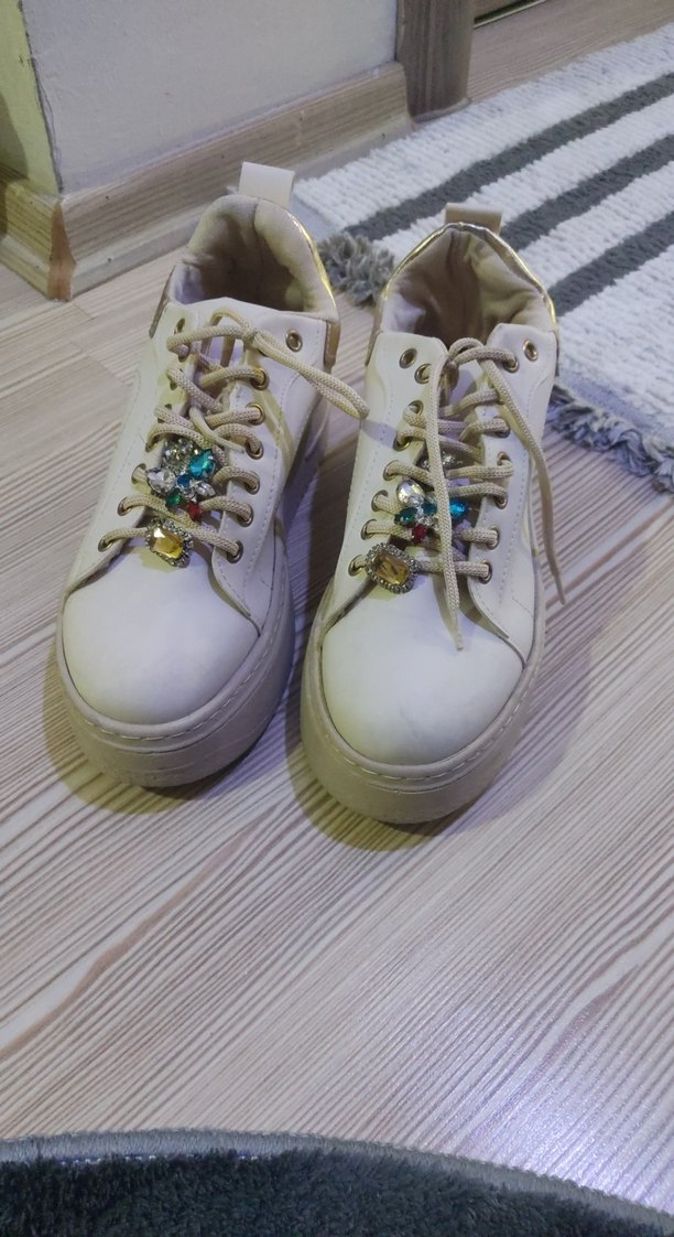 Beyaz platform topuklu kadın spor ayakkabılar, bağcıklarında taş detaylara sahip. isterseniz taşlar çıkıyor Kauçuk tabanlı, günlük kullanım için uygun, trend sokak tarzını yansıtır. Bir kere giydim fazlalıktan satışta