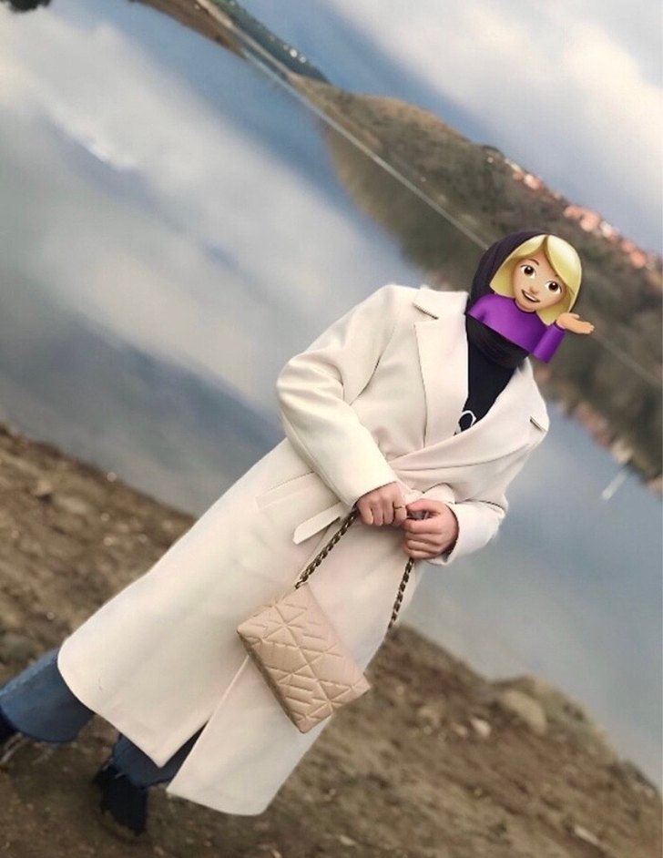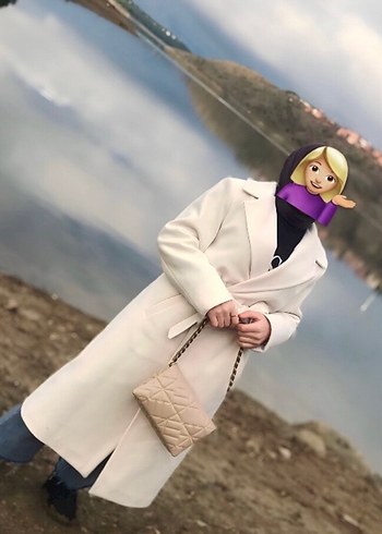 Krem renginde, kemer detaylı uzun kaban. Klasik yaka ve tam kapama özelliğiyle soğuk havalar için uygun.
