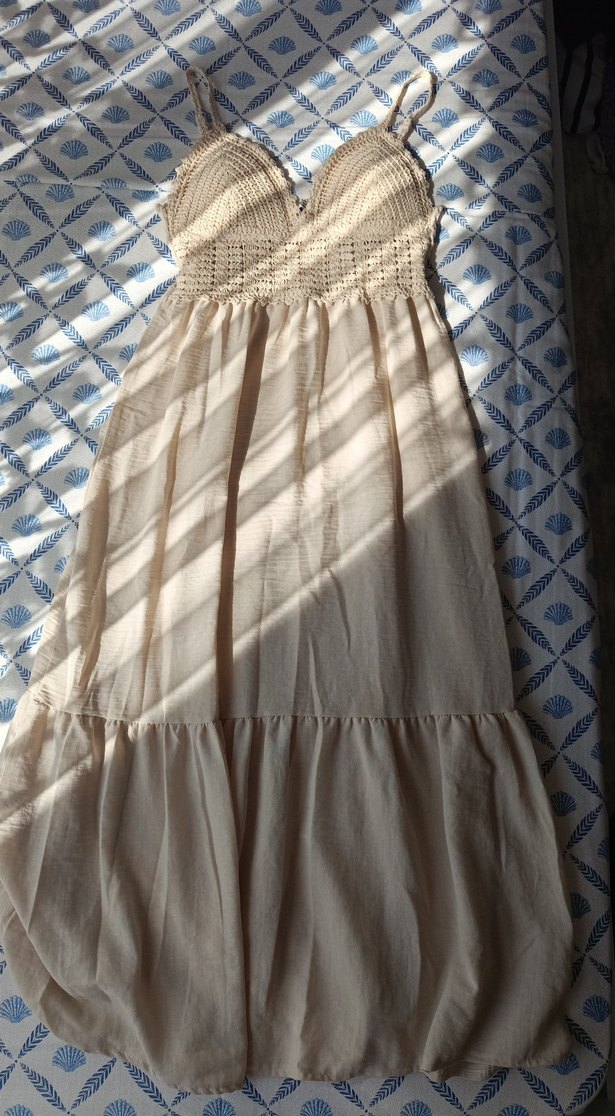Krem renk , ip askılı , göğüs dekolteli, midi elbise beden L