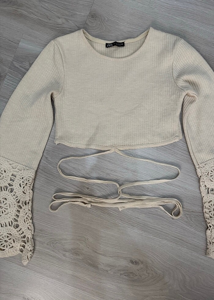 Bej/krem renkli belden bağlamalı kol detaylı bluz. Sorunsuzdur.