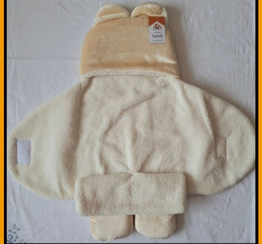 Yumuşak ve sıcak krem renkli kulaklı kapüşonlu bebek battaniyesi. Desensiz ve rahat kullanıma uygun.