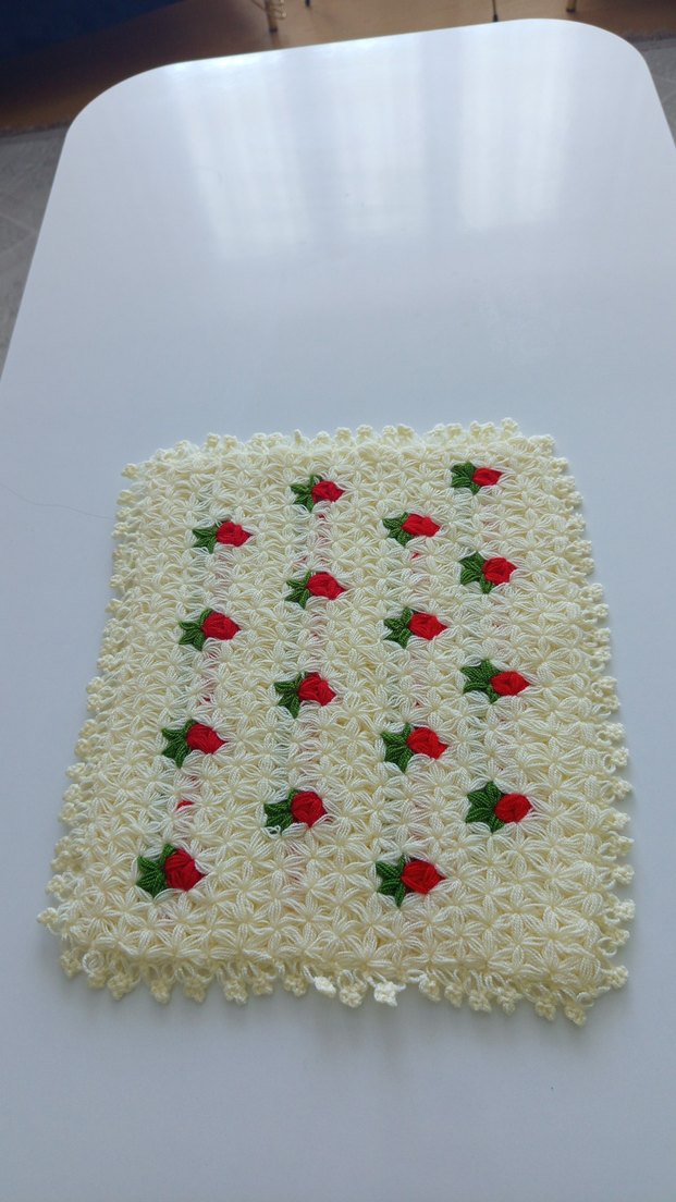 Krem rengi bazlı, küçük kırmızı ve yeşil çiçek desenleriyle süslenmiş, dekoratif ve kullanışlı banyo süngeri.