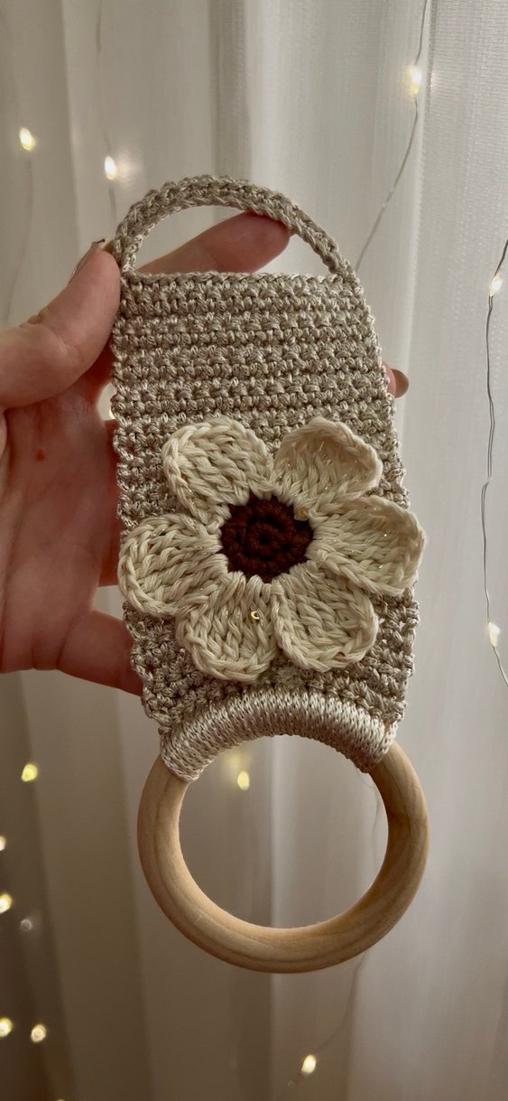El yapımı Ahşap halkalı, krem ve bej renklerde, yumuşak örme çiçek detaylı havlu askısı. Evinizin her köşesinde kullanarak şık ve pratik bir görünüm sağlayabilirsiniz.