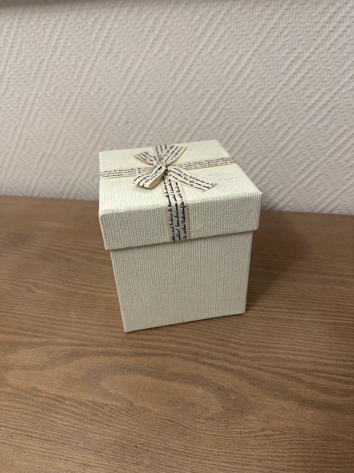 Dokulu yüzeye sahip krem renkli hediye kutusu, üstünde dekoratif kurdele ile süslenmiştir. Küçük hediyeler için uygundur.