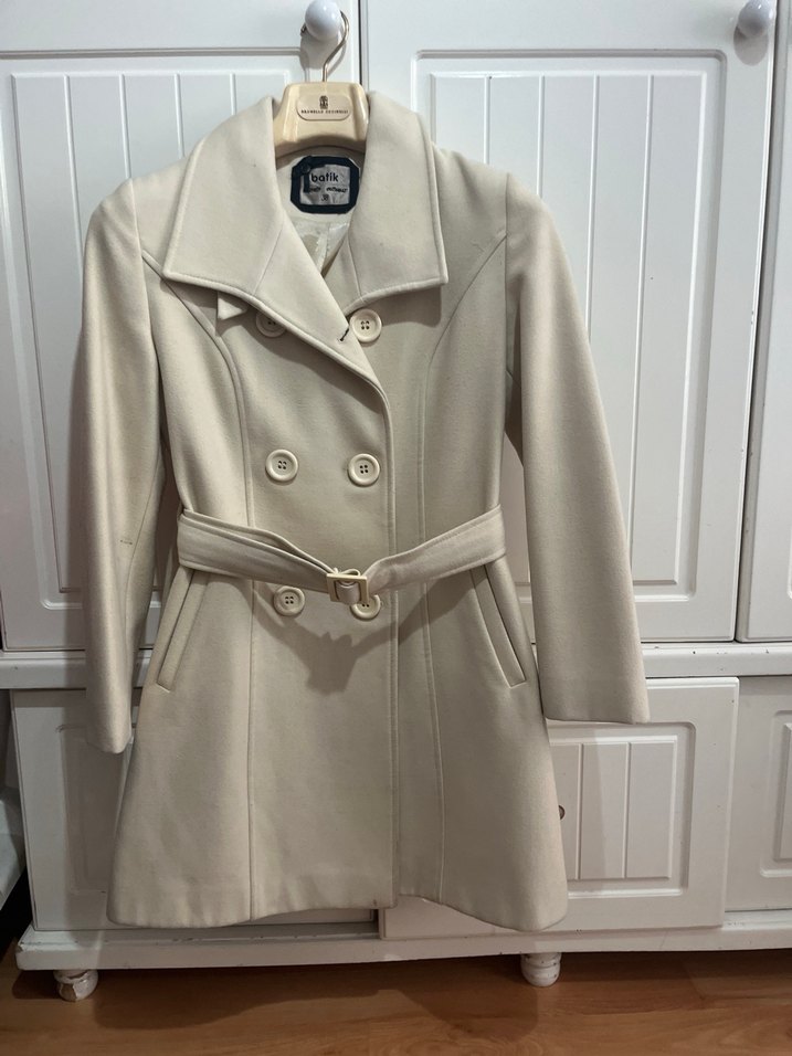 Krem rengi, çift düğmeli, kemerli ve geniş yakalı kaban. Yan cepleriyle şık ve düzenli bir görünüm sunar.