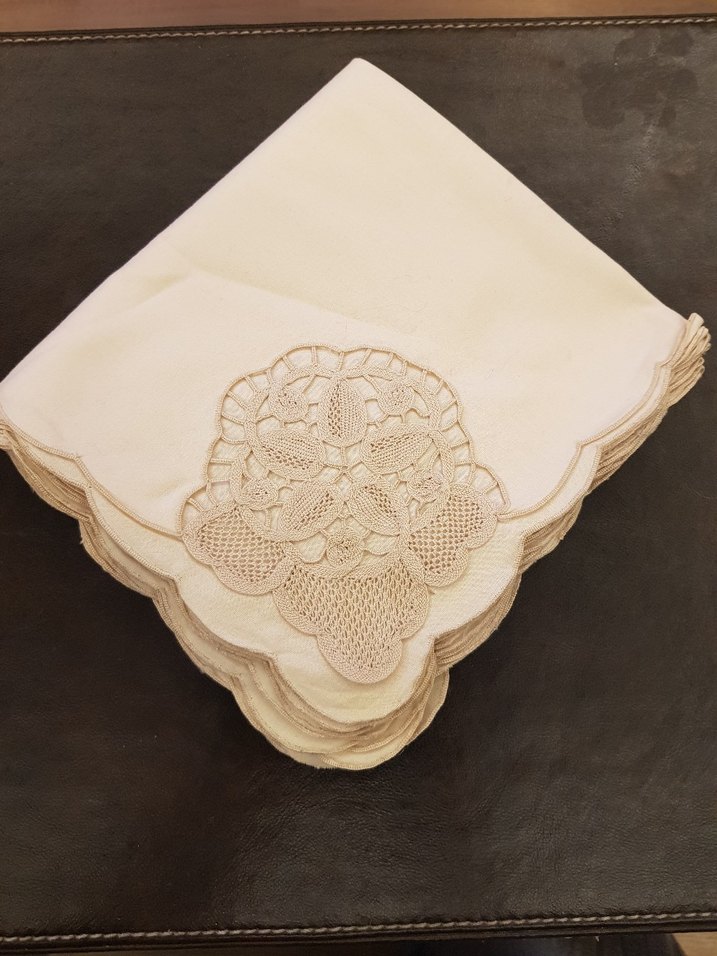 Krem renkli dantel angles peçete takimi, ince nakışlı desenlere ve vintage, klasik bir tarza sahiptir. Hafif ve zarif bir görünüme sahiptir. 40×40 ebadında olup hiç kullanılmamıştır fiyat 12 adet için verilmiştir.