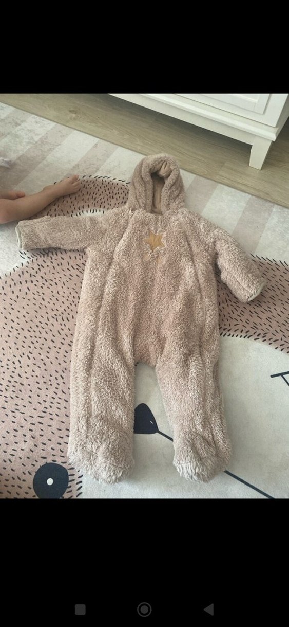 Krem rengi, peluş dokulu kapüşonlu bebek tulumu, önünde küçük yıldız detayı bulunur. Rahat ve sıcak tutar. çok kalın kışın kurtarıcı sorunu yok yeni gibi sayılı giyildi pudra gibi bir rengi var kendinden ellikli