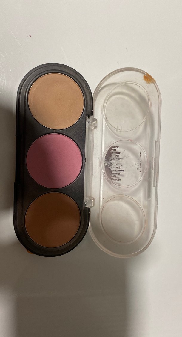 Krem renkli üç tonlu allık paleti, çeşitli makyaj stilleri için uygun. Şeffaf kapak renk seçimini kolaylaştırır.