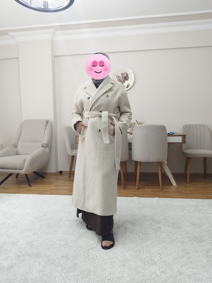 Krem renginde, uzun ve çift düğmeli tasarıma sahip, belden kuşaklı klasik kaban. Soğuk havalar için uygun şık bir model. ürünün satılış nedeni renginin açık olması 2 kez giyildi