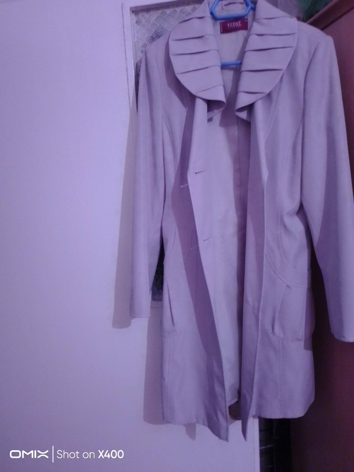 Krem renkli, uzun ve düğmeli kadın kaban. Notlu yaka ve uzun kollu, sentetik kumaştan, ofis için uygun, sade ve şık tasarım.