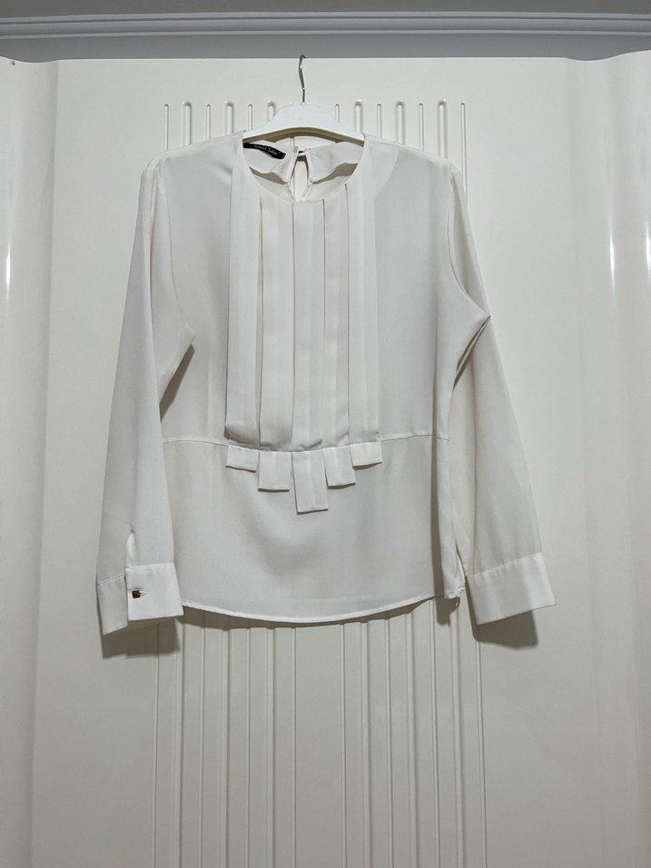 Krem renkte uzun gömlek gömlek, bisiklet yaka ve önünde pile detayına sahiptir. Uzun kollu ve regular fit, modern klasik stilde kısa boyda ve desensizdir. Ofis için uygundur.