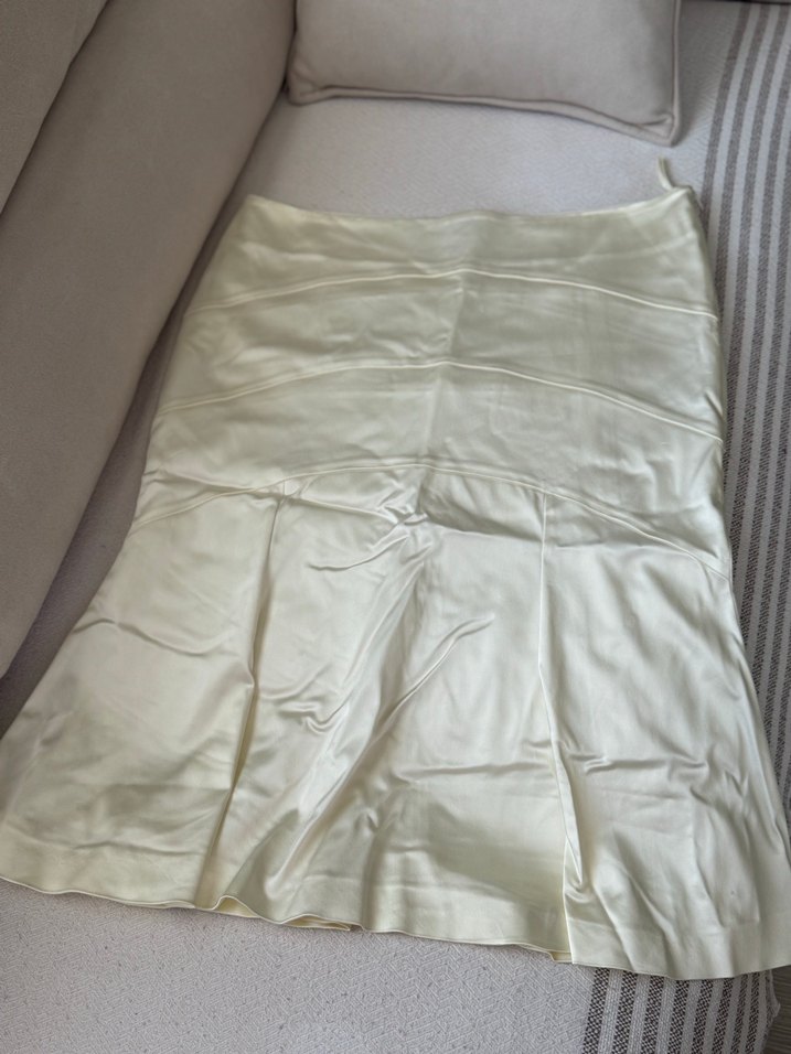 Parlak krem, saten görünümlü kumaştan, drapeli tasarıma sahip, normal uzunlukta ve vücuda oturan hamile eteği. Düğün için çağdaş ve minimalist tarzda. Ölçüler fotoğrafta yer almaktadır. Takımı olan ceket profilimde yer almaktadır.