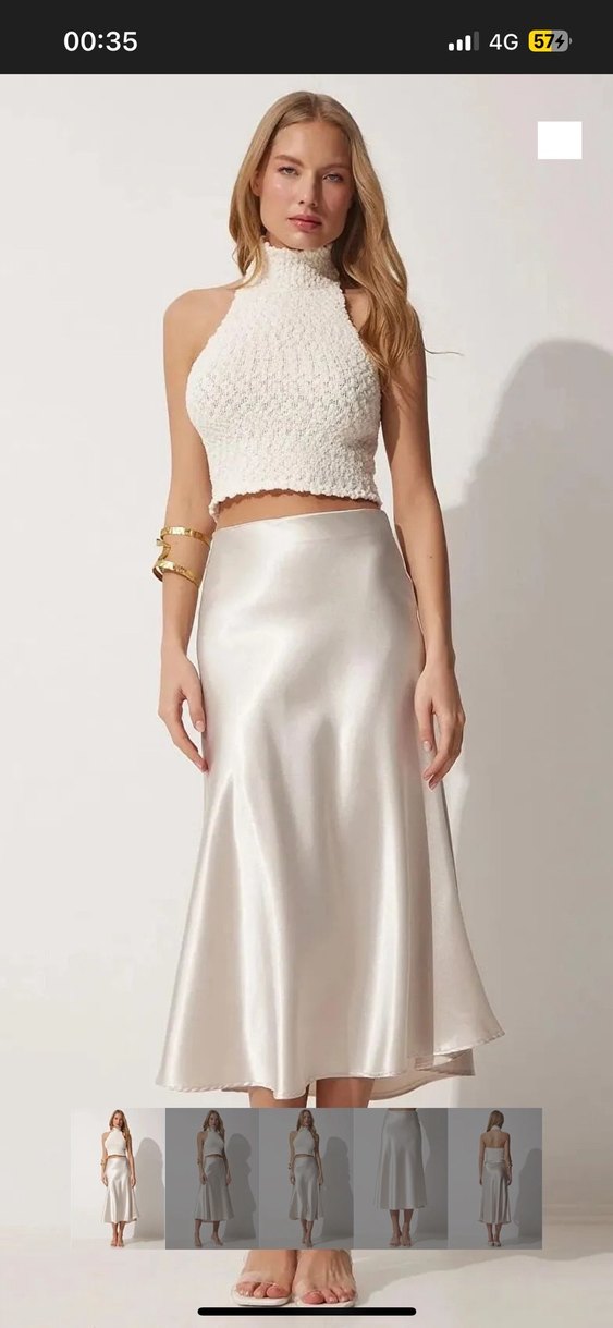 Krem renkli, saten görünümlü midi boy, vücuda oturan etek. Minimalist ve bohem tarzıyla zarif ve şık, düğün için uygun. ✨