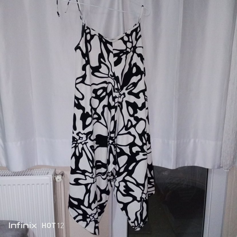 Kayık yaka, kolsuz, bol kesim, bağcıklı desenli uzun tulum. koton kumaştan, günlük kullanıma uygun.