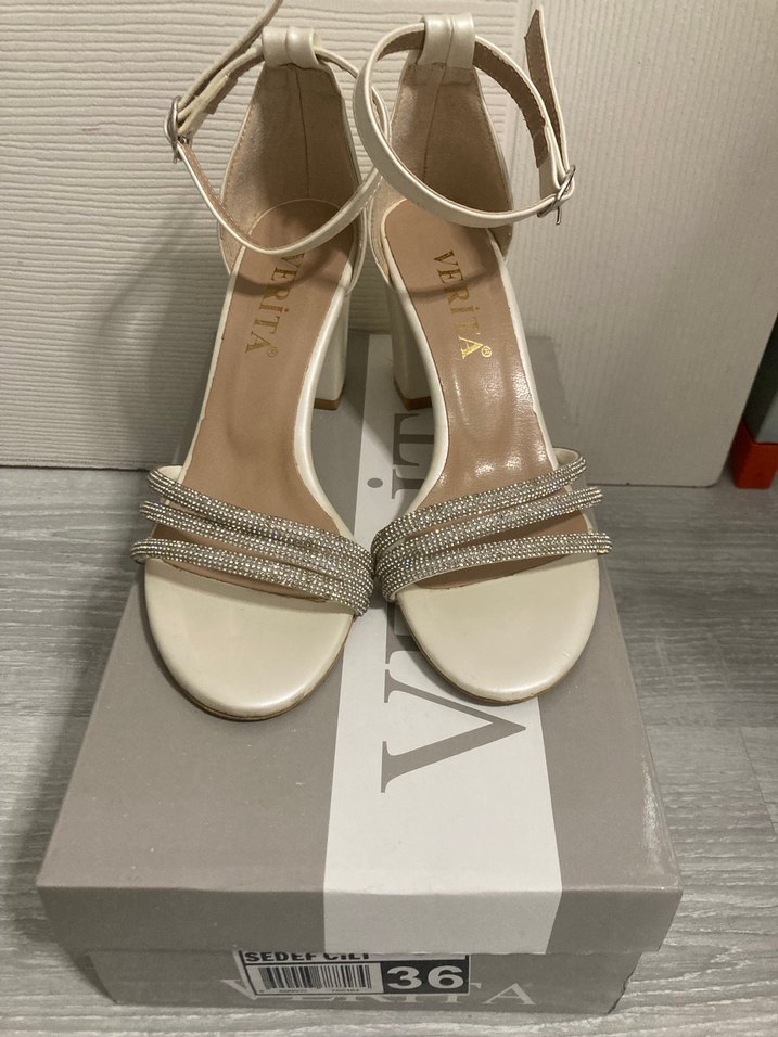 Krem tokalı, taş detaylı topuklu kadın abiye ayakkabılar. Düğünler için uygun, modern klasik tarzda ve hafif desenli, kauçuk tabanlı. Kalın topuklu rahattır kızım mezuniyetinde bir kez giydi