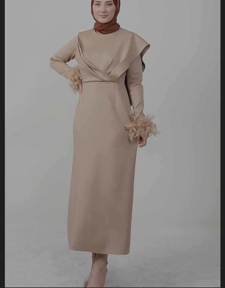Kolları tüylü krem elbise. 1 kez kullandım rahat likralı bir kumaşı var.