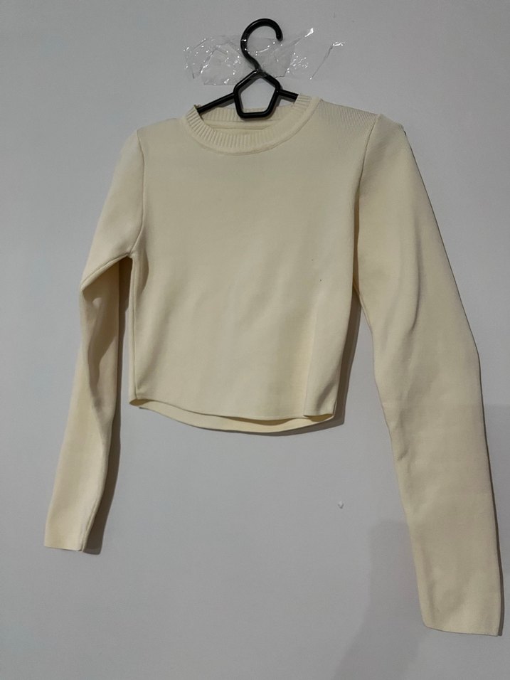 Uzun kollu ve bisiklet yaka, krem kadın kazak. Yumuşak sentetik kumaştan, sade ve şık. Günlük rahat ve trend sokak stiline uygun. ✨