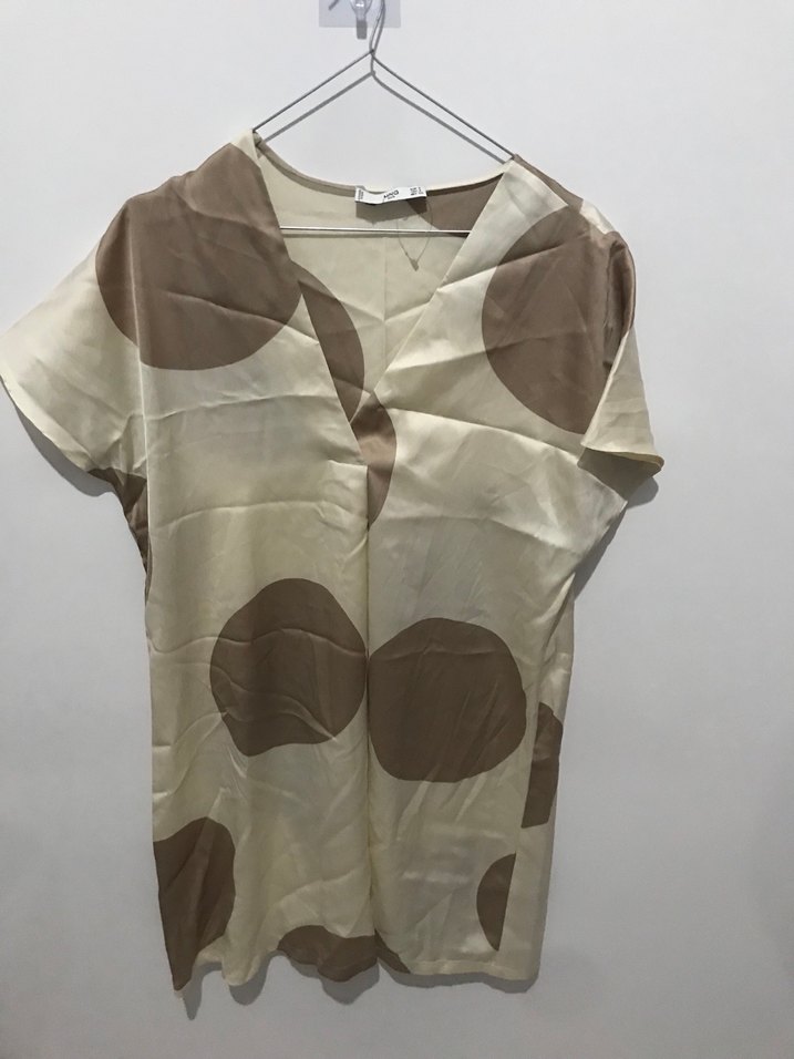 Krem renkli, V yakalı ve kısa kollu kadın elbise, ipeksi kumaştan, bol kesime sahip. Baskılı deseni ve çağdaş stiliyle günlük kullanıma uygundur.