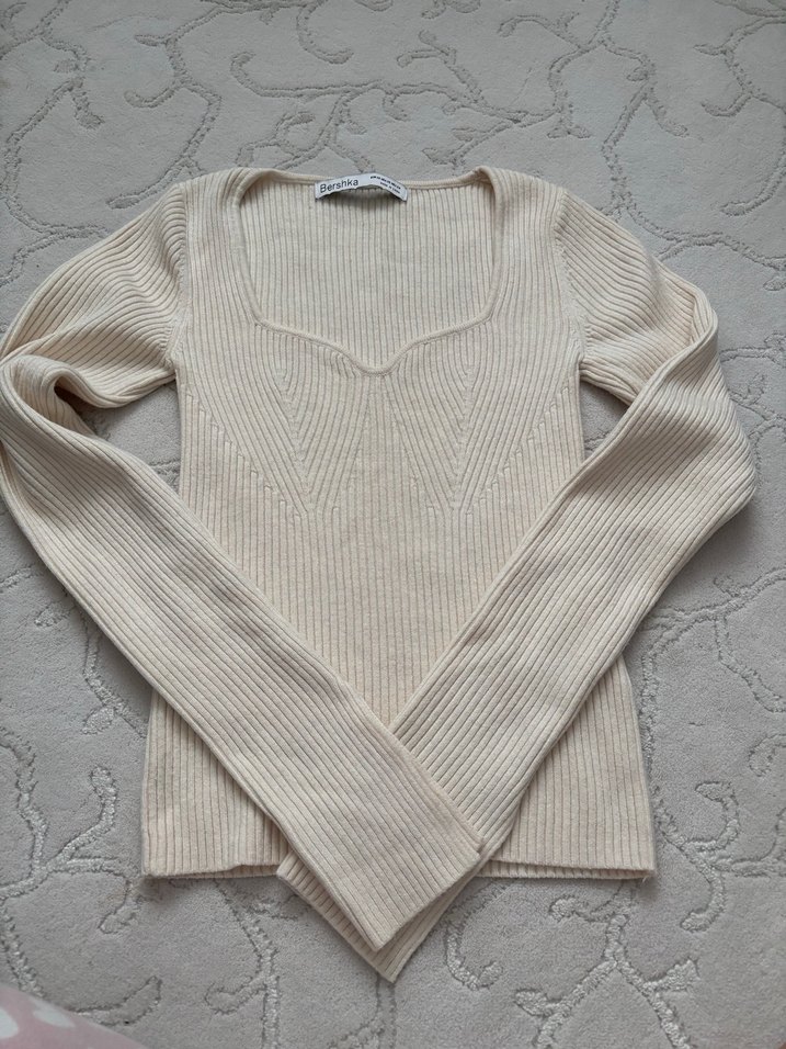 Krem renkte, V yakalı ve uzun kollu, örgü dokulu ve vücuda oturan kadın kazak. Rahat ve gündelik normcore tarzını yansıtır.