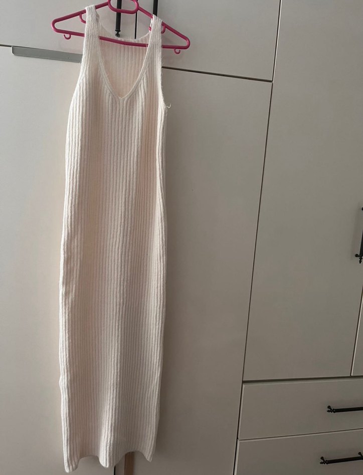 Krem V Yaka Uzun Triko Elbise