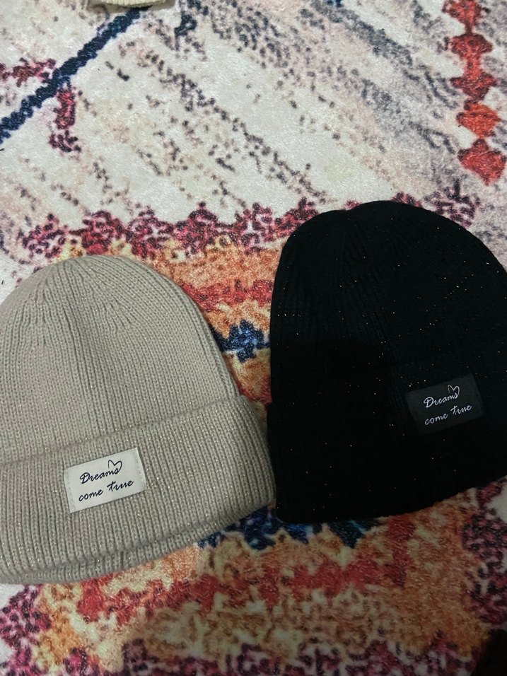 Gri renkli, örgü kadın bere. "Dreams come true" yazılı etiketiyle bohem, hippie ve retro tarzına uygun rahat sokak stili bere.