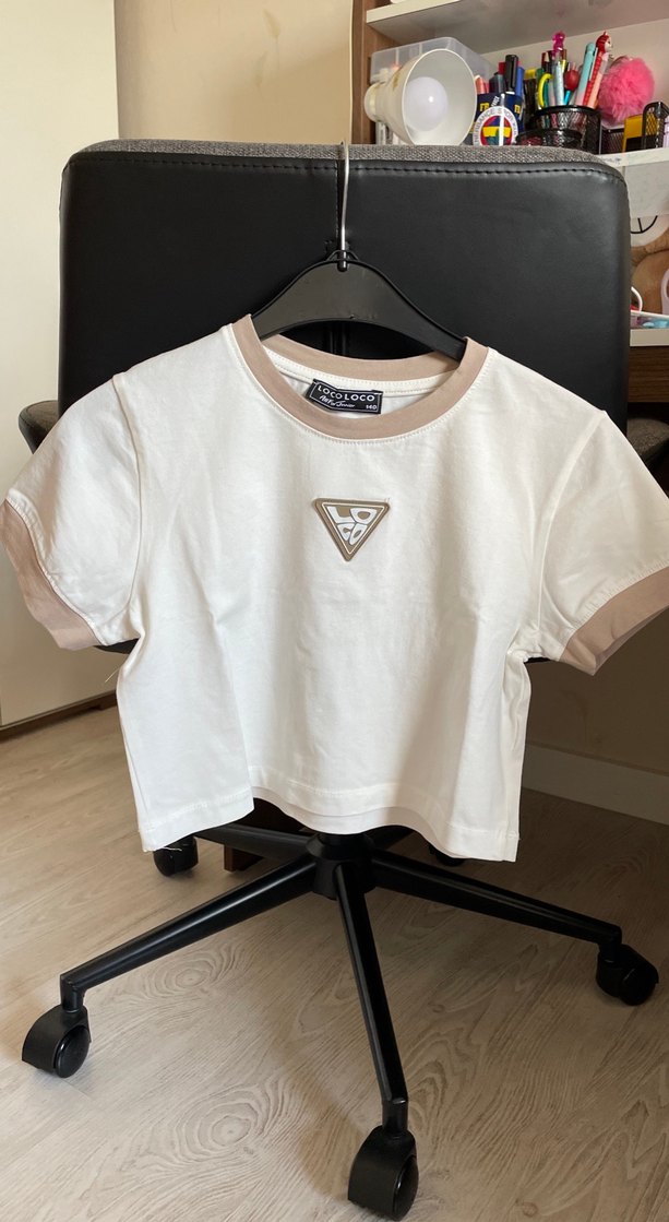 Krem yakalı beyaz crop tişört, kısa kollu ve pamuklu kumaştan. Baskılı logo detayı ve rahat kesimiyle günlük şıklık sunar.