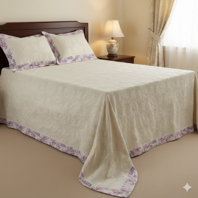 Krem yatak örtüsü, pastel çiçek desenli kenar süslemeleriyle yatak odanıza zarif bir dokunuş katıyor. ️