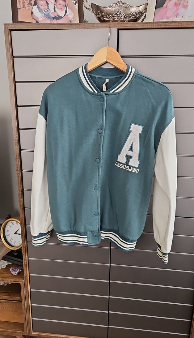 yesil ve kollar krem tonlarda, çıtcıtli, uzun kollu, yuvarlak yakalı,arkası baskılı ve rahat kesim kadın spor ceketi. içi polar ,yumuşak kumaştan üretilmiştir.