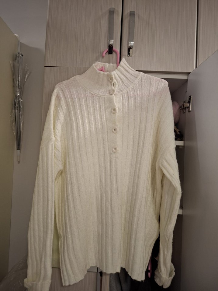 Krem renkli, yüksek yakalı, düğmeli ön detaylı Fitilli kadın kazak. Uzun kollu, bol kesim ve midi boyda, rahat kullanıma uygun. İKİ KERE GİYİLDİ, YENİ GİBİ
