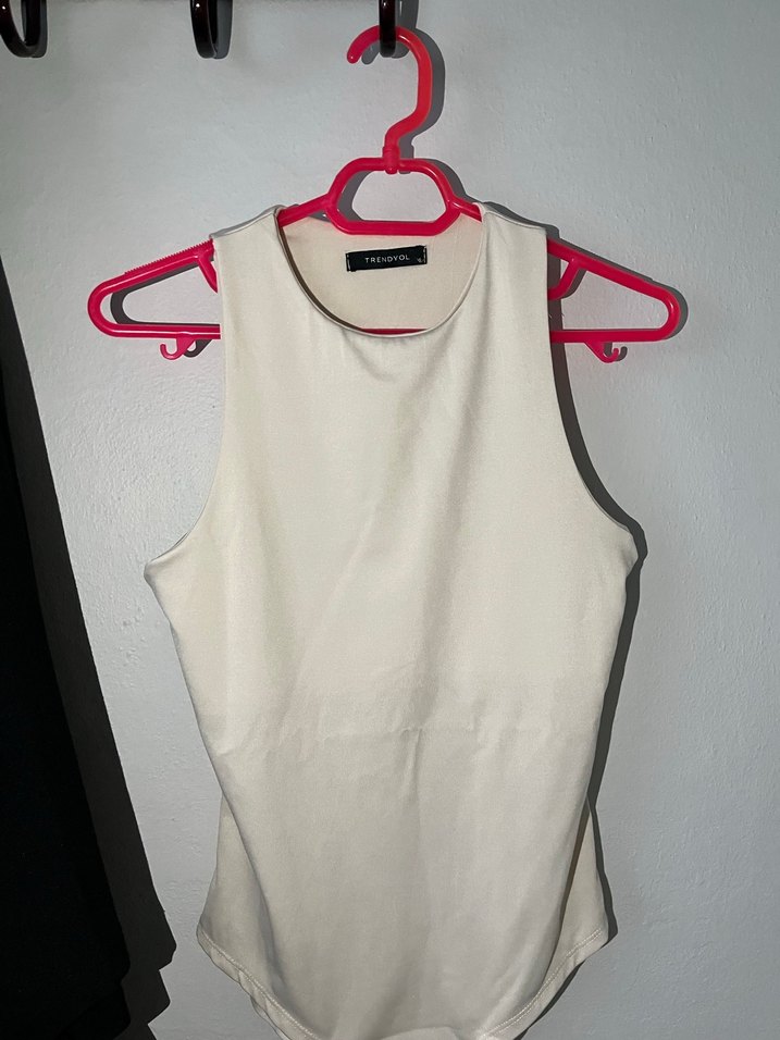 Krem renkte, kolsuz ve yüksek yakalı, vücuda oturan body. Rahat kullanım sağlar.