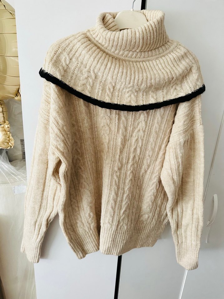 Krem renkli, yüksek yakalı ve uzun kollu örgü kazak. Siyah şerit detayı ve rahat kesimiyle günlük kullanıma uygundur. Milla marka hiç giyilmedi etiketi kopuk