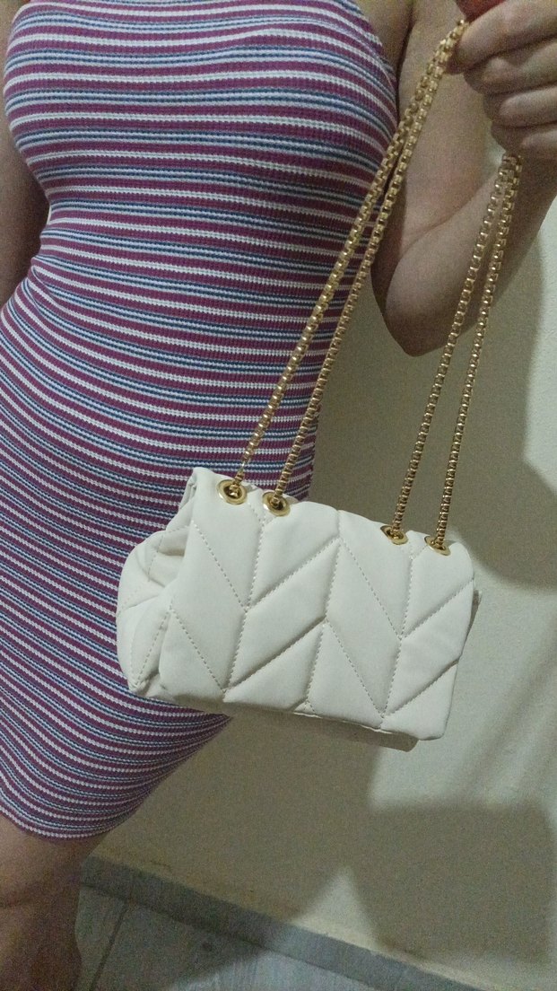 Dikişli krem sentetik kumaştan kadın çanta, fermuarlı ve altın zincir askılı, şık sokak stiline uygun.