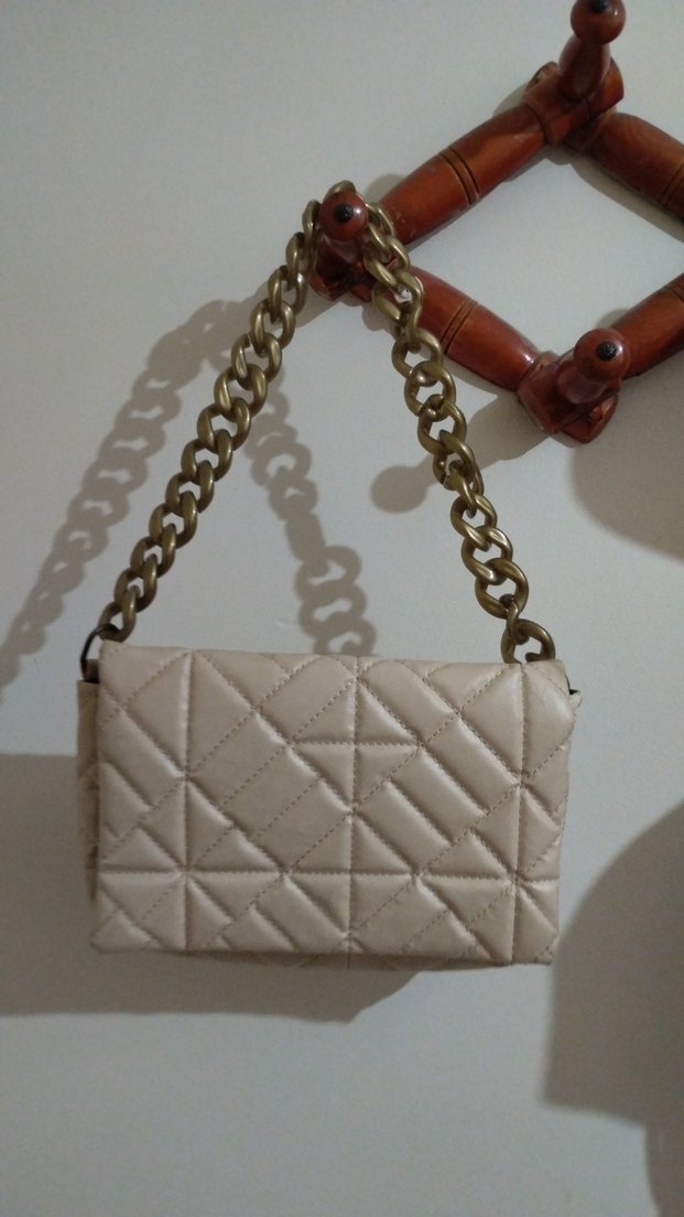 Zincir detaylı krem deri kadın çanta, kapitone desenli. Günlük kullanım için uygun, sokak modasına uyumlu.
