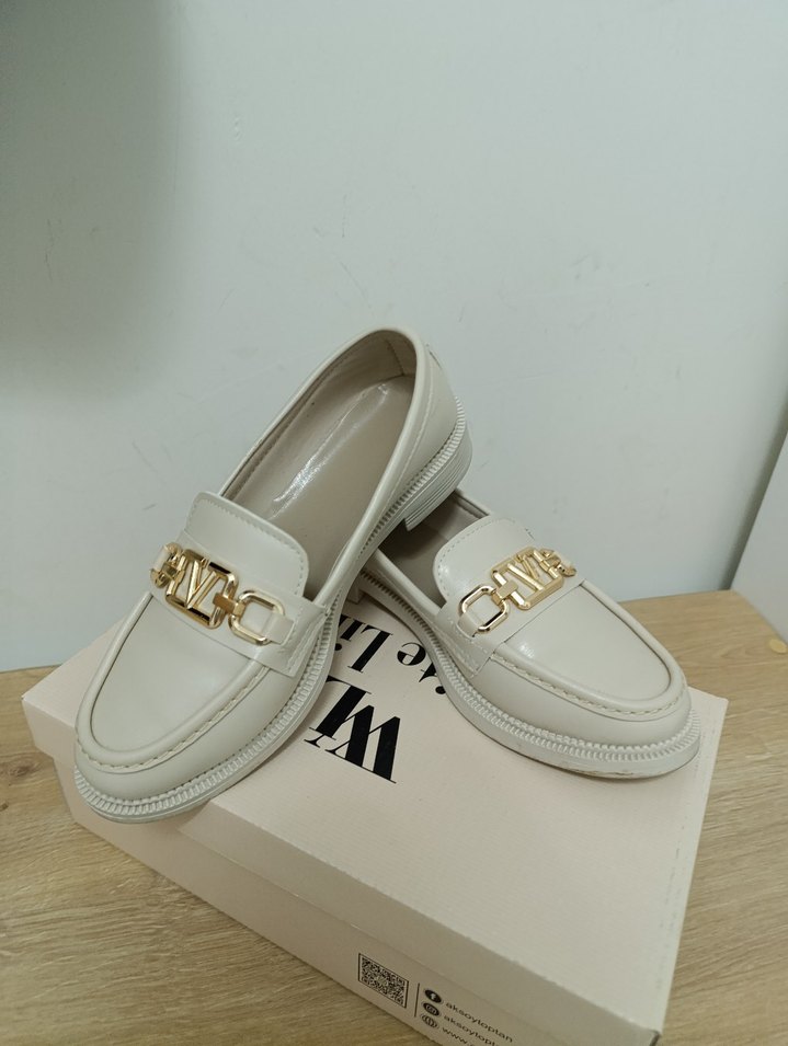 Krem renkte, zincir detaylı ve blok topuklu kadın loafer. Kauçuk malzemeden, ofis kullanımı için uygun, hafif renk ve baskılı desenle trendy tarzda.