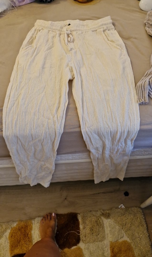 Bol kesim, midi boy, krem keten pantolon. Sade ve rahat bohem tarzıyla günlük kullanıma uygun, zahmetsiz şıklık sunar.