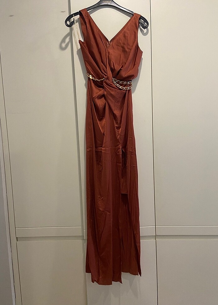 Kremit reng v yaka uzun yırtmaçlı elbise