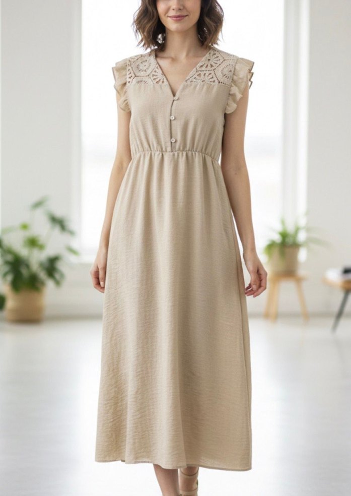 Keten kumaştan, pilili ve V yakalı, kolsuz uzun elbise. Gevşek kesimi ve minimalist bohem tarzıyla günlük kullanıma uygundur.