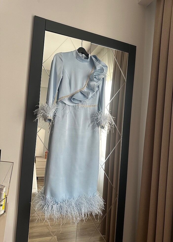 Özel dikimdir bir kez sözümde giydim Elbisenin boyu bilek boydur Renk: bebe mavisi Boyum:160 Kilom:48