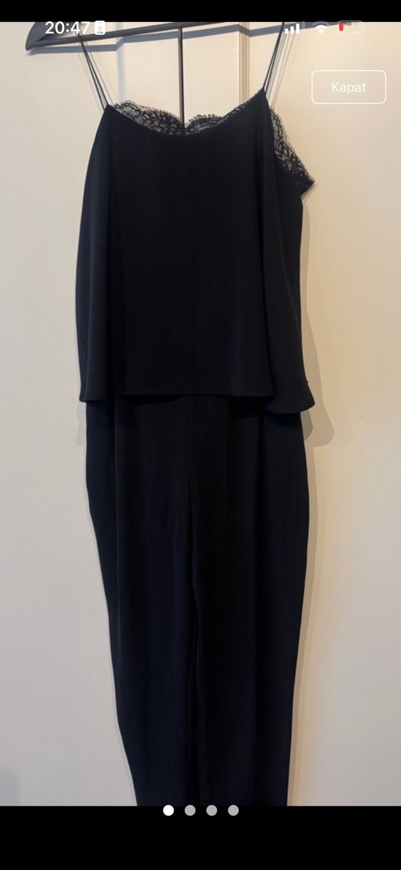 Siyah renkte, drapeli tasarıma sahip uzun tulum. Yüksek yakalı ve kolsuz, ipeksi kumaştan yapılmıştır. Ofis için minimalist goth tarzında, rahat kesim tulum.