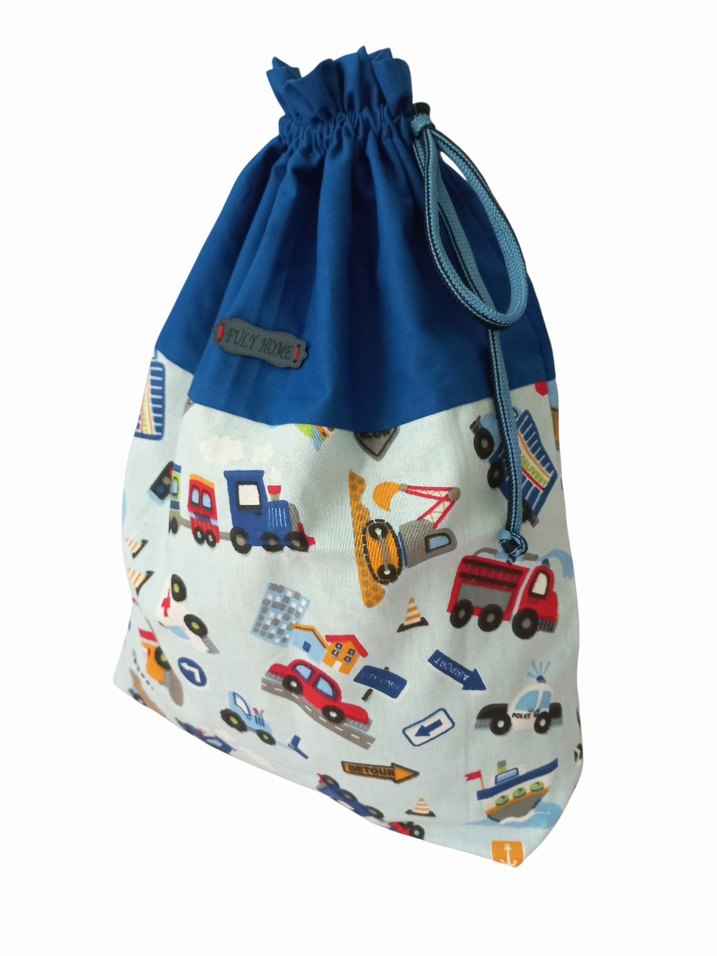 Canlı renklerde, araç desenli mavi çocuk kreş kesesi kolay taşınabilirliği sağlayan ipli kapama özelliğine sahiptir.