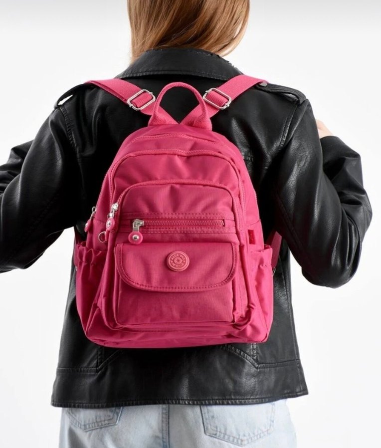 Kadınlar ve erkekler için su geçirmez özellikli krinkıl kumaş fermuarlı, canlı pembe renkli ve tie-dye desenli sırt çantası. Sentetik kumaştan, günlük sokak modasına uygun rahat ve şık.çok bölmeli